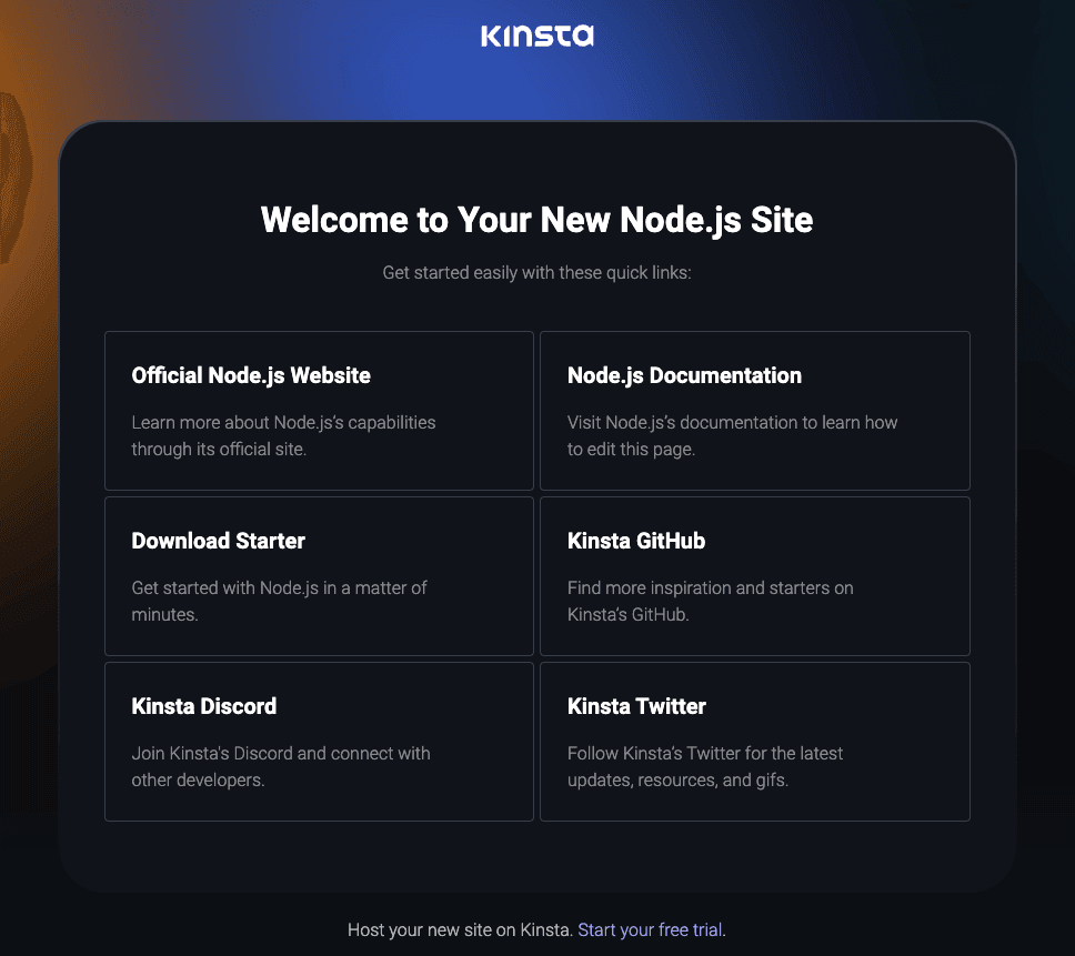Durante a implantação, a Kinsta detecta automaticamente o Comando Start para o processo web e instala as dependências definidas em seu arquivo package.json. O aplicativo estará disponível assim que a implantação for concluída, e a página de boas-vindas da Kinsta será carregada na URL do aplicativo.